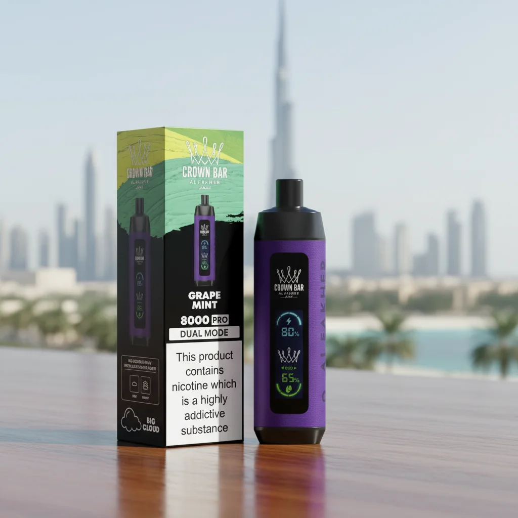The crown-bar-al-fakher-8000-puffs-grape-mint disposable vape delivers refreshing shisha flavour with up to 8,000 smooth puffs. Designed for UAE vapers, it’s compact, lightweight, and ready to use immediately. Draw-activated and portable, it ensures consistent taste from the first puff to the last.